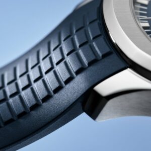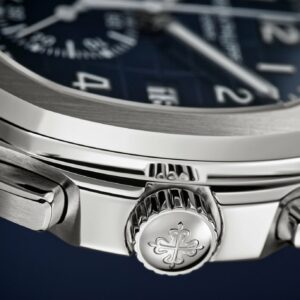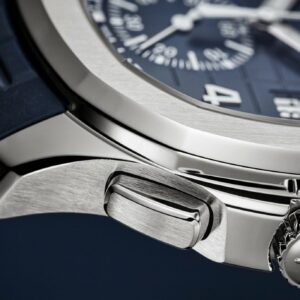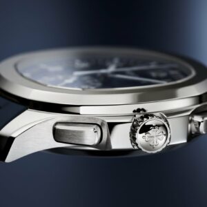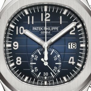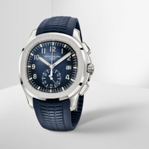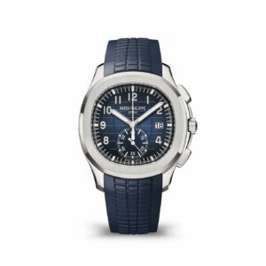 New Patek Philippe Aquanaut Chronograph luxury sports watch, 42,2mm, 18k White Gold, Ref. 5968G-001. The first chronograph with a flyback function in the modern Aquanaut sports collection, which perfectly matches the character of this young and dynamic watch line. His 18k White Gold rounded, pillow-like octagon-shaped case and gently curved ears are unmistakable. The beautiful embossed dial features a radial gradient transition of a slightly lighter blue center and darker blue fading to black at the edges, giving it an even three-dimensional look. Perfectly readable large applied polished Arabic numerals made of 18k White Gold with luminescent coating in the form of hour markers look harmoniously. The manufacturer paid special attention the second track on the outer rim of the dial. She is applied with long and short silvery with lines with fairly wide luminous marks located every 5 minutes. Large polished luminous hour and minute hands in 18 k White Gold indicate the time. These are complemented by a slim and elegant chronograph second hand (Sweep seconds hand). At the 6 o’clock position, there is a recessed black auxiliary chronograph counter with reverse movement repeating which follows the rounded octagonal shape of the bezel. It has glowing white Arabic numerals, white markers, and a white indicator needle. The date window is traditionally at the 3 o’clock position. Rectangular 18 k White Gold buttons located on the right side of the case control the chronograph. At the 8 o’clock, position on the case is an instant date corrector. A polished 18 k White Gold screw-down crown with a ribbed edge for a comfortable grip and the Patek Philippe logo is the finishing touch to the perfect picture. The dial is covered with a scratch-resistant sapphire crystal. The screw-down case back is also made of sapphire crystal, which allows you to see the magical work of the movement. Against this backdrop, a flat, fixed bezel in 18 k White Gold, vertically ground on the front and polished on the sides, provides a wide view of the dial. The finish on the side of the bezel is amazing because at first glance, it looks rounded, but upon closer inspection, you can see the crisp edges playing with the light. The model is equipped with a Patek Philippe caliber CH 28‑520 C with a self-winding mechanical movement containing 32 jewels and a power reserve of min. 45 hours – max. 55 hours. This beautiful sport chic watch is presented on a midnight blue tropical rubber strap. This new composite material is highly resistant to wear, salt water and UV radiation. The strap are fastens with Patek Philippe’s patented 18 k White Gold folding clasp, polished and engraved with the Calatrava cross. Opening the clasp reveals the engraved Patek Philippe logo with the word GENEVE. Water resistant up to 120m/394ft (12 ATM).