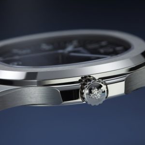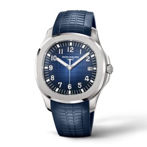 New Patek Philippe Aquanaut luxury sports watch, second hand with date, 42.2 mm, 18k White Gold, Ref. 5168G-001. They are reliable and practical, modern and somewhat unexpected, inspired by Nautilus. Their 18k White Gold case features a rounded, cushion-shaped octagon that is unmistakable. It has polished crown guards protruding from the right side of the watchcase to protect it. The beautiful embossed dial features a radial gradient transition of blue with a slightly lighter blue center and darker blue edges, giving it an even more three-dimensional look. Perfectly readable large applied polished Arabic numerals made of 18k White Gold with luminescent coating in the form of hour markers look harmoniously. On the outer rim of the dial, a silver second track is printed with fairly wide luminous marks located every 5 minutes. The time is indicated by large polished 18k White Gold luminescent rod-shaped hour and minute hands, as well as a thin and elegant Sweep Seconds hand. The aperture date indicator is traditionally located at the 3 o’clock position. A polished 18k White Gold screw-down crown with a ribbed edge for a comfortable grip and the Patek Philippe logo are the finishing touch to the perfect picture. The dial is covered with a scratch-resistant sapphire crystal. The case back is also made of sapphire crystal, which allows you to see the magical work of the movement. Against this backdrop, the fixed 18k White Gold bezel, satin-brushed on the front and polished on the sides, provides a wide view of the dial. The model is equipped with a Patek Philippe caliber 26‑330 S C with a self-winding mechanical movement containing 30 jewels and a power reserve of min. 35 hours – max. 45 hours. This beautiful sport chic watch is presented on a blue tropical rubber strap, made from a new composite material that is ultra-resistant to wear, salt water and UV radiation, and embellished with the exact same pattern as the dial, which beautifully ties all parts of the watch together. It fastens with Patek Philippe’s patented 18k White Gold folding clasp, polished and engraved with the Calatrava cross. Opening the clasp reveals the engraved Patek Philippe logo with the word GENEVE. Water resistant up to 120 m/394ft (12 ATM).
