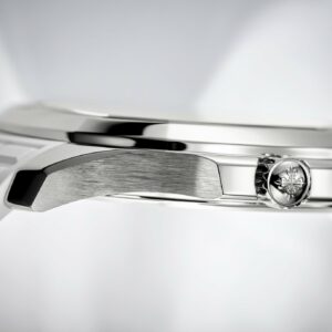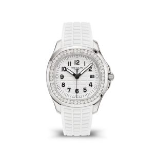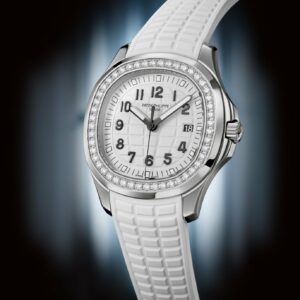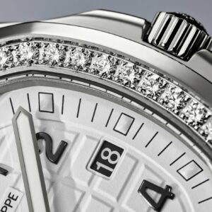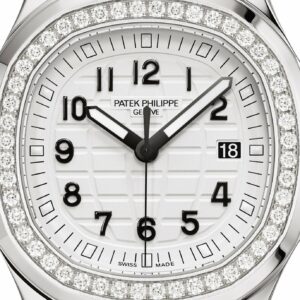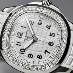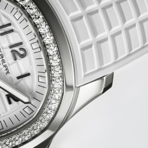 New Patek Philippe Aquanaut Luce luxury Ladies watch, with a larger diameter 38,8mm, Stainless Steel, Ref. 5267/200A-010. The first complex quartz wristwatch in the modern Aquanaut sports collection, which perfectly matches the character of this young and dynamic watch line. His Stainless Steel rounded, pillow-like octagon-shaped case and gently curved lugs, complemented by polished and satin finishes are unmistakable. On a beautiful Matte white dial with embossed “Aquanaut” harmoniously looks perfectly readable large applied polished Arabic numerals made of blackened 18k White Gold with luminescent coating in the form of hour markers. The manufacturer paid special attention to the second track on the outer rim of the dial, on which applied black lines with fairly wide luminous marks located every 5 minutes. Large polished luminous hour and minute hands in blackened 18k White Gold indicate the time. These are complemented by a slim and elegant second hand (Sweep seconds hand). The date window is traditionally at the 3 o’clock position. A polished Stainless Steel screw-down crown with a ribbed edge for a comfortable grip and the Patek Philippe logo is the finishing touch to the perfect picture. The dial is covered with a scratch-resistant sapphire crystal. The screw-down Solid case back is made of Stainless Steel. The elegant highlight of this model is the fixed sparkling Stainless Steel bezel set with 48 diamonds totaling 1,1cr with polished on the sides, provides a wide view of the dial. The finish on the side of the bezel is amazing because at first glance, it looks rounded, but upon closer inspection, you can see the crisp edges playing with the light. The model is equipped with a Patek Philippe caliber E 23‑250 S C with a Quartz movement powered by a silver oxide battery with a 3-year lifespan. This beautiful sport chic watch is presented on an Integrated matte white Composite material strap. He is highly resistant to wear, salt water and UV radiation. The strap are fastens with Patek Philippe’s patented Stainless Steel folding clasp, polished and engraved with the Calatrava cross. Opening the clasp reveals the engraved Patek Philippe logo with the word GENEVE. Water resistant up to 120m/394ft (12 ATM).