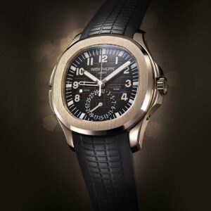 New Patek Philippe Aquanaut Travel Time luxury sports watch, 40,8mm, 18k Rose Gold, Ref. 5164R-001. They are reliable and practical, modern and somewhat unexpected, inspired by Nautilus. Their 18k Rose Gold case features a rounded, cushion-shaped octagon that is unmistakable. It has polished crown guards protruding from the right side of the watchcase to protect her. The beautiful embossed brown dial is one tone lighter than the strap, which has the same geosphere pattern. This color combination of dial and strap is the main attraction of this model. Perfectly readable large applied polished Arabic numerals made of 18k Rose Gold with luminescent coating in the form of hour markers look harmoniously. On the outer rim of the dial, a silver second track is printed with fairly wide luminous marks located every 5 minutes. The local time is indicated by large polished luminous 18k Rose Gold hour and minute hands, as well as a thin and elegant second’s hand (Sweep seconds hand). In addition, this model has an additional skeleton hand, which indicates the time of the second time zone. She can be controlled using rectangular 18k Rose Gold buttons on the case. The first, which is at 8 o’clock moves the second time zone hand forward in one-hour increments, while its twin at 10 o’clock moves the same hand back. There are small day/night apertures at 9 and 3 o’clock positions for both time zones, and a subdial date counter is visible at 6 o’clock. A polished 18k Rose Gold screw-down crown with a ribbed edge for a comfortable grip and the Patek Philippe logo is the finishing touch to the perfect picture. The dial is covered with a scratch-resistant sapphire crystal. The case back is also made of sapphire crystal, which allows you to see the magical work of the movement. Against this backdrop, a flat, fixed bezel in 18k Rose gold, vertically ground on the front and polished on the sides, provides a wide view of the dial. The finish on the side of the bezel is amazing because at first glance, it looks rounded, but upon closer inspection, you can see the crisp edges playing with the light. The model is equipped with a Patek Philippe caliber 26‑330 S C FUS with a self-winding mechanical movement containing 29 jewels and a power reserve of min. 35 hours – max. 45 hours. This beautiful sport chic watch is presented on a Dark Brown tropical rubber strap, made from a new composite material that is ultra-resistant to wear, salt water and UV radiation. It fastens with Patek Philippe’s patented 18k Rose Gold folding clasp, polished and engraved with the Calatrava cross. Opening the clasp reveals the engraved Patek Philippe logo with the word GENEVE. Water resistant up to 120 m/394ft (12 ATM).